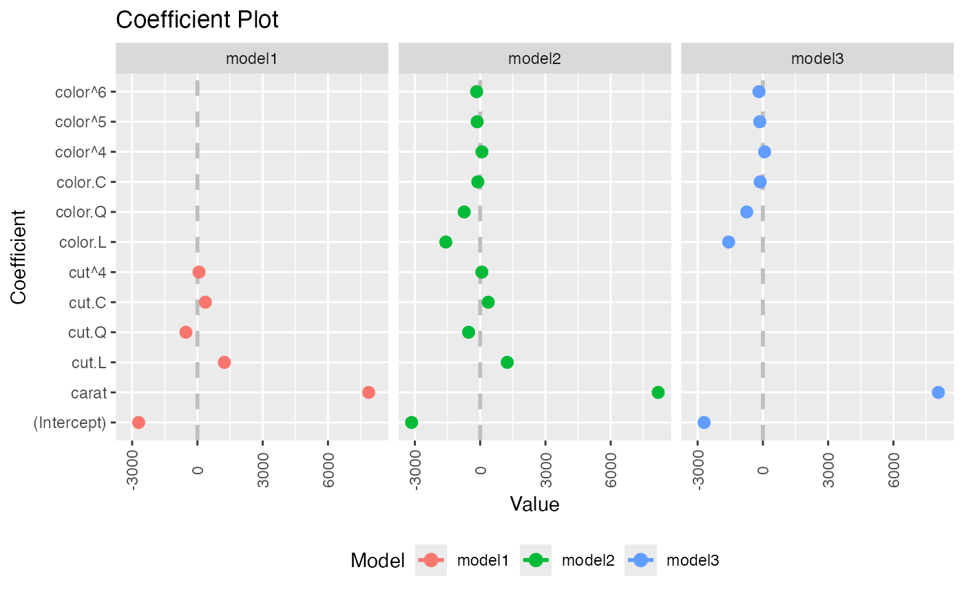 If "Coefficient" then a normal multiplot is plotted, if "Model" then the coefficients are plotted along the axis with one for each model. If plotting by model only one coefficient at a time can be selected. This is called the secret weapon by Andy Gelman.