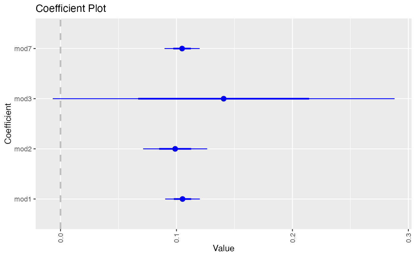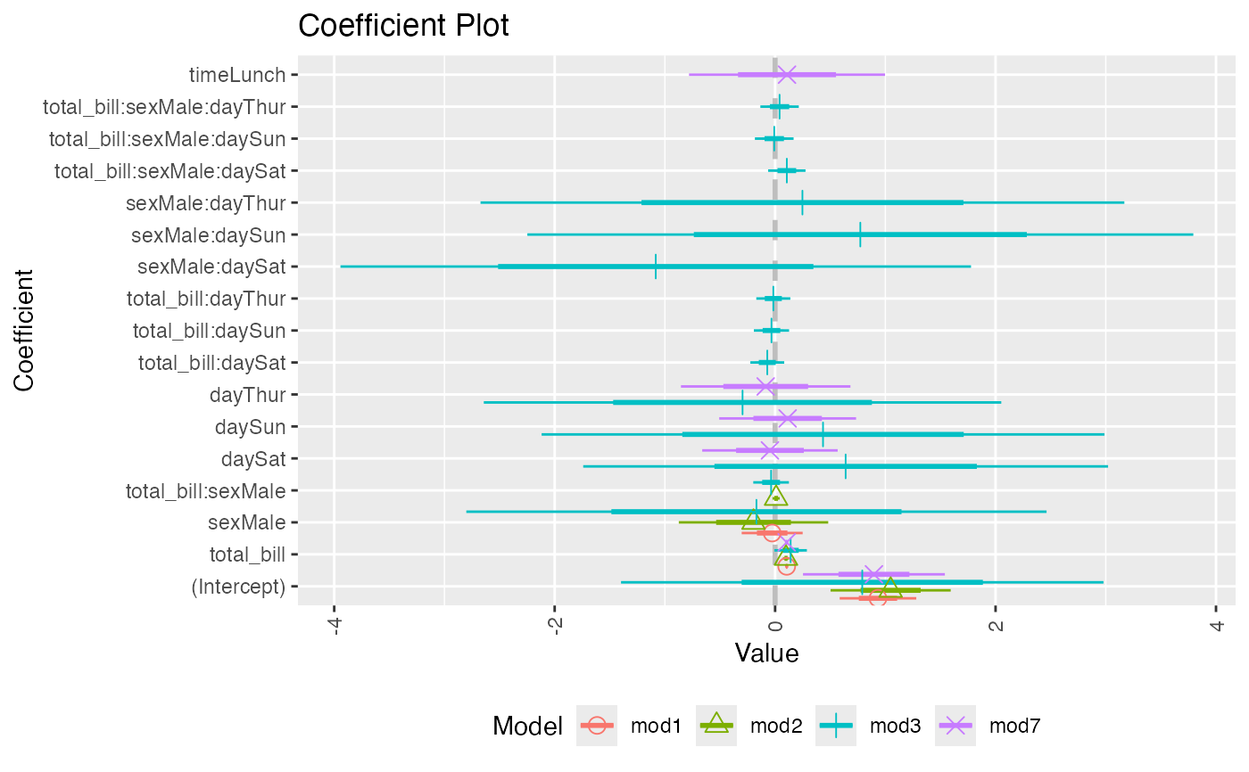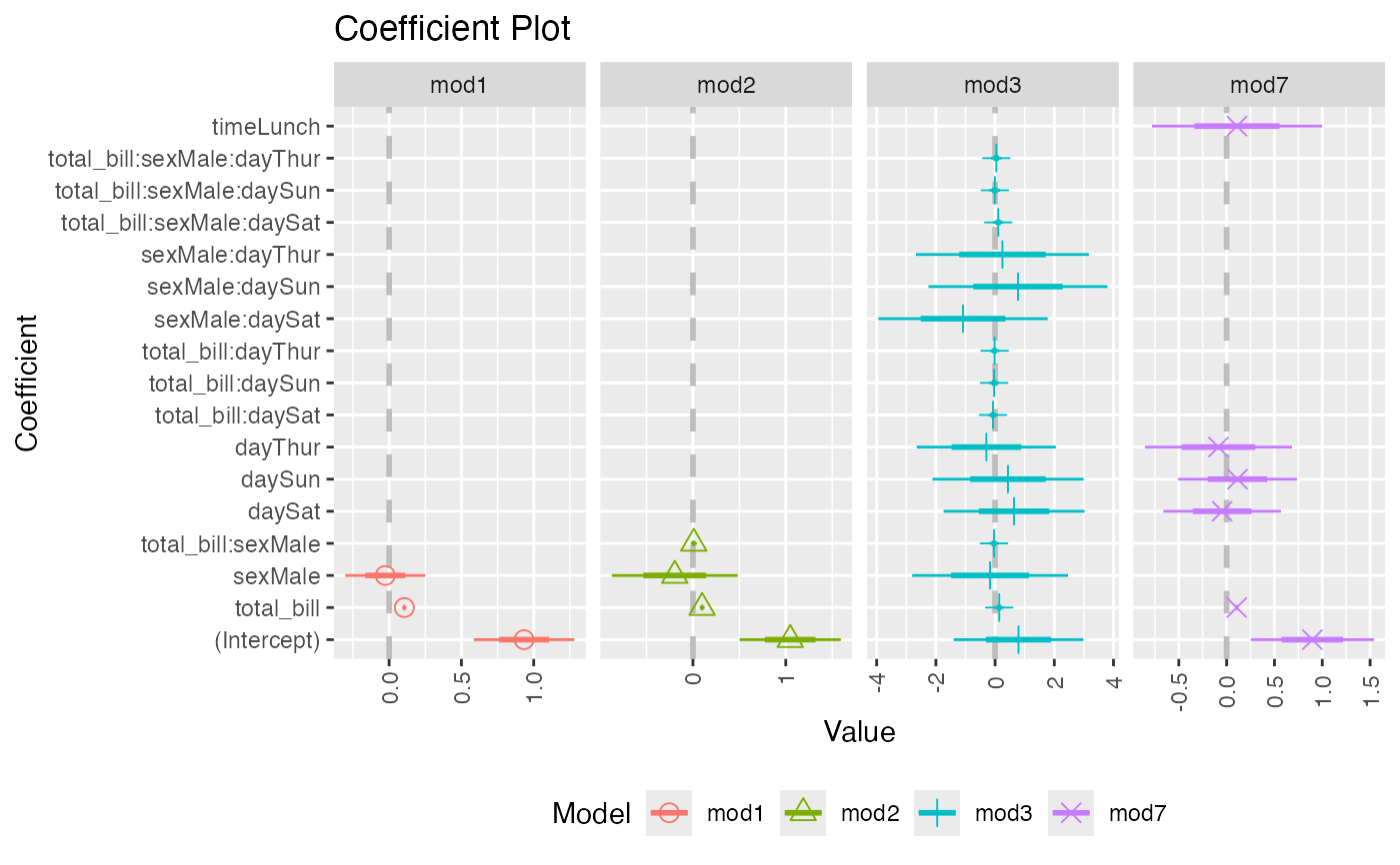 multiplot(mod1, mod2, mod3, mod7, coefficients="total_bill", by="Model", horizontal=FALSE)