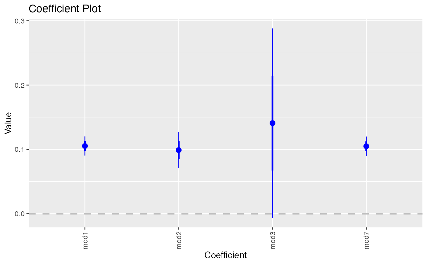 For now, if names is provided the plots will appear in alphabetical order of the names. This will be adjusted in future iterations. When setting by to "Model" and specifying exactly one variable in variables that one coefficient will be plotted repeatedly with the axis labeled by model. This is Andy Gelman's secret weapon.